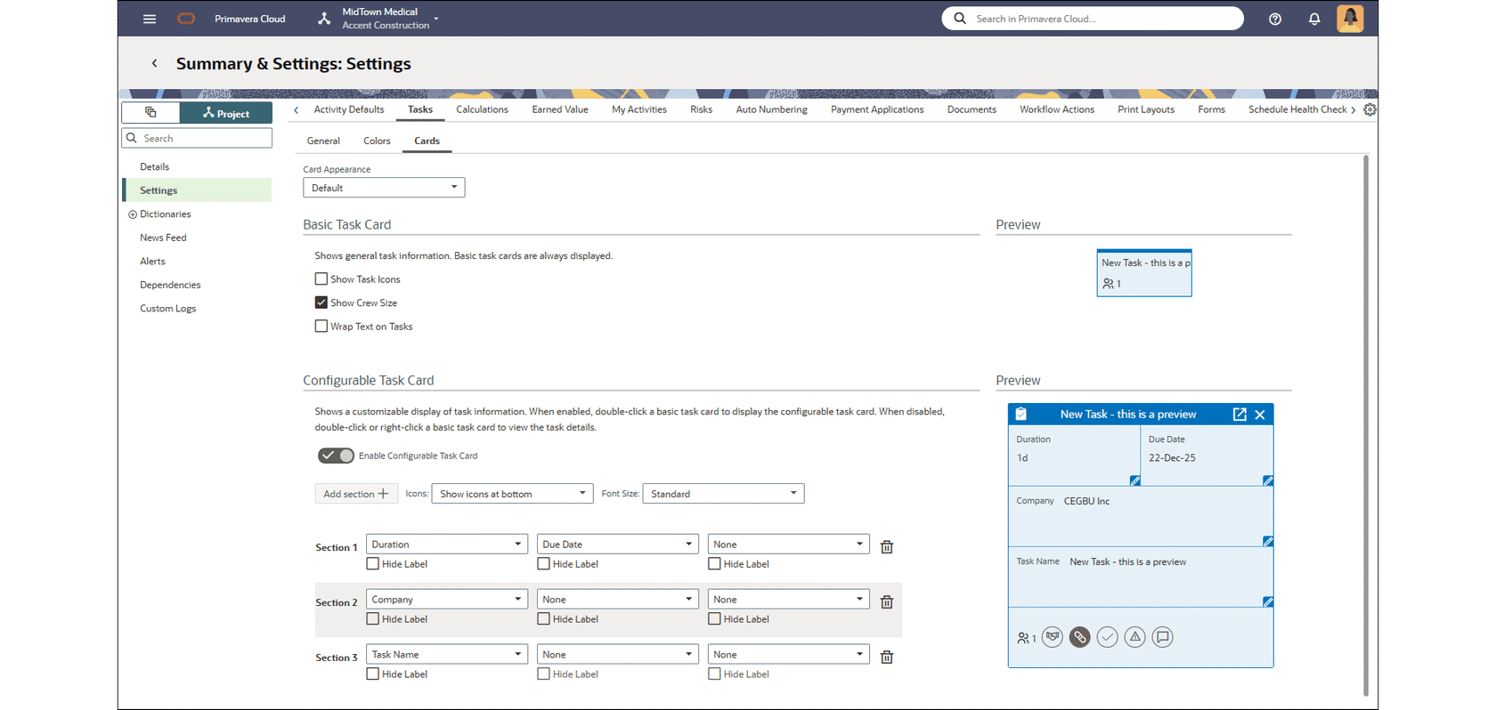 Configure Task Cards at the Project Level