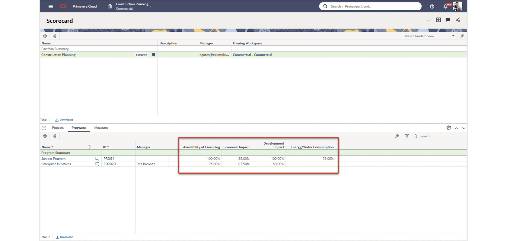 You can now add evaluation category columns on the Programs tab of the Portfolio Scorecard. Assess programs in the portfolio using the same evaluation category details as on Projects tab, with filtering available by evaluation category values.