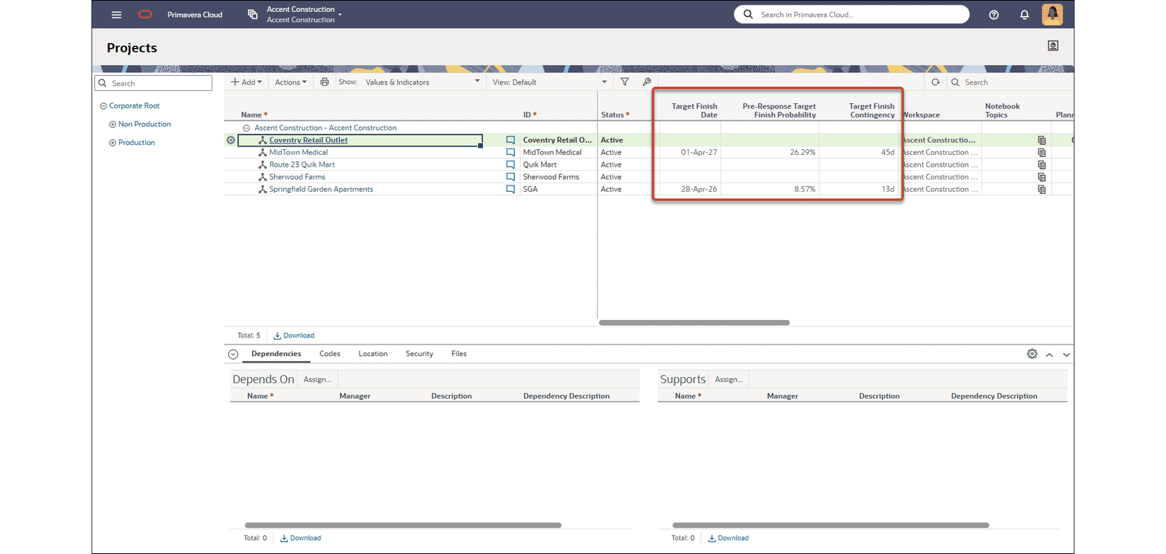 Run a risk analysis, and then set Target Finish Date and At Completion Cost values. Target data is generated, including the probability of hitting the target, and the contingency, or difference between the deterministic and target values. This data is now available to display on the Projects List page, use in configured fields, or add to reports, and charts and dashboards to evaluate the likelihood of finishing on time and under budget.