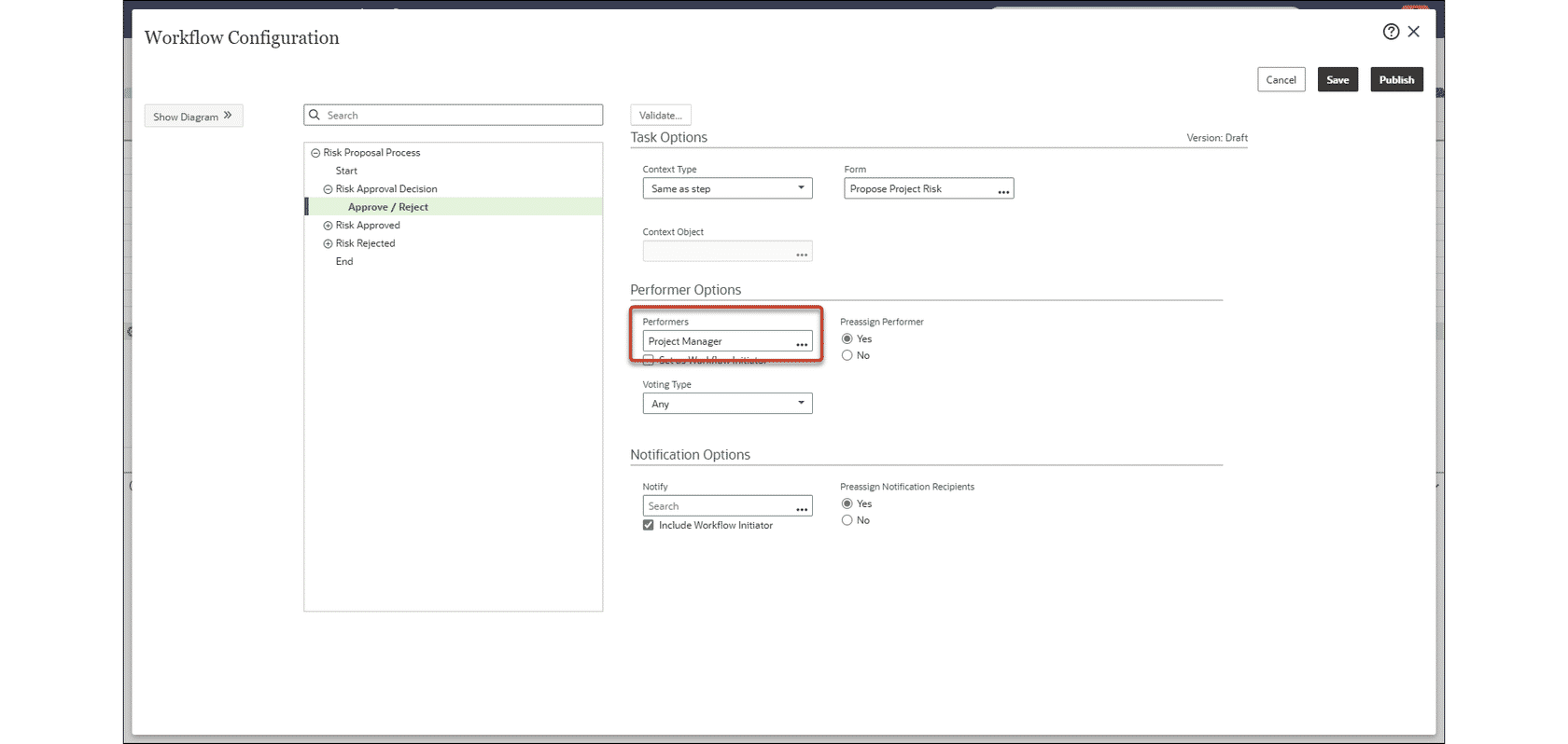 Project Manager has been added to the list of available performers when configuring a risk proposal workflow. Assign this value to allow the individual assigned as the Manager in the project details to perform workflow actions, such as approving or rejecting a proposed risk.