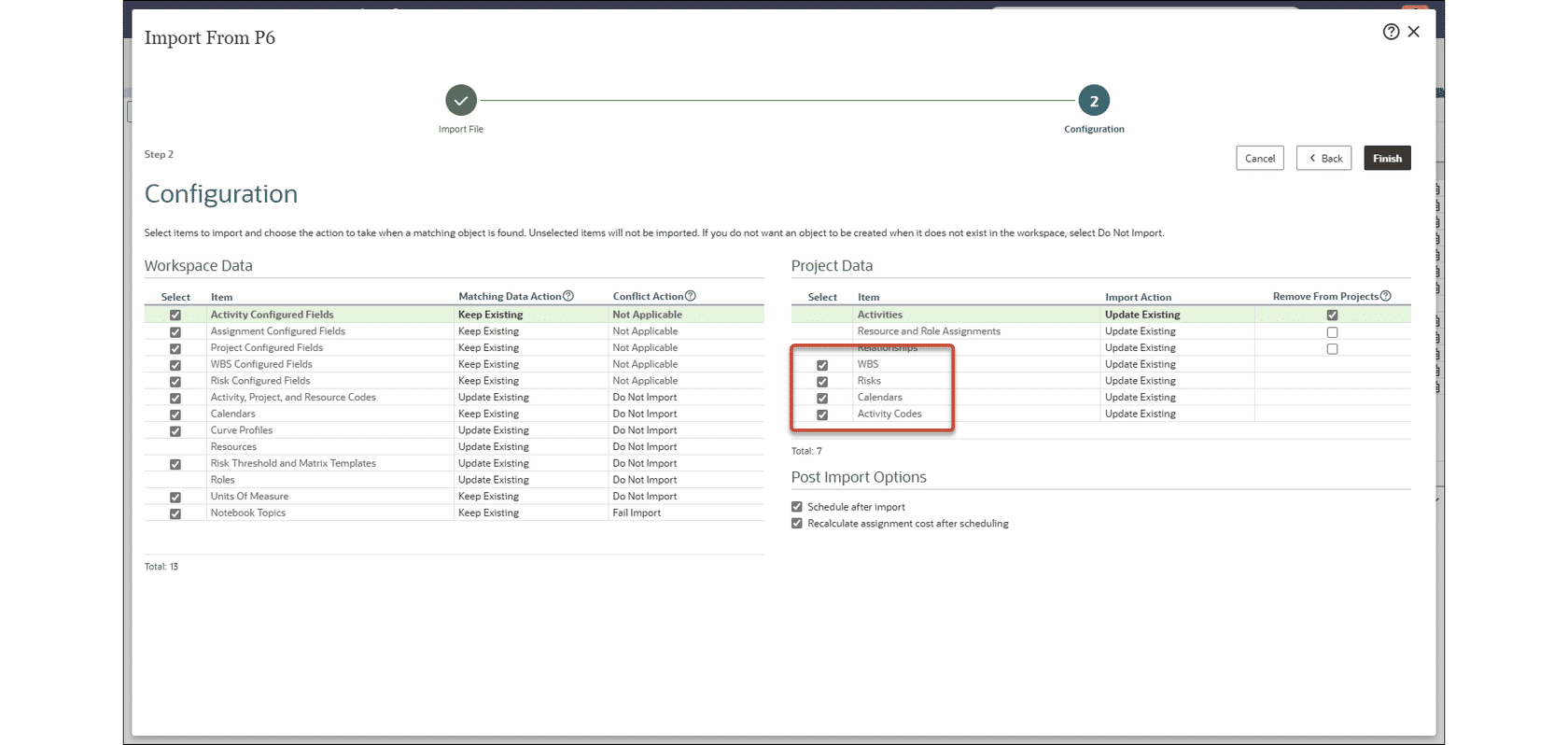 The Import from P6 wizard now allows you to exclude project data from the import. On the Configuration step, clear the checkboxes for WBS, Risks, Calendars, and Activity Codes if you do not want those elements to be imported with the project.
